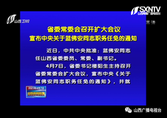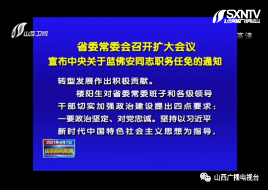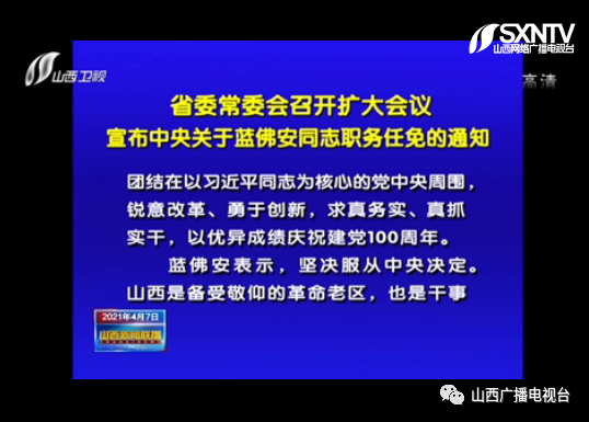 蓝佛安表示,坚决服从中央决定。山西是备受敬仰的革命老区,也是干事创业的一方热土,能够来山西工作深感荣幸,一定在以楼阳生书记为班长的省委领导下,修身律己,恪尽职守,把工作干好、把职责尽到。坚定理想信念、站稳政治立场,坚持求真务实、勇于担当作为,坚决维护团结、担好协助职责,自觉接受监督、守好廉洁底线,不断提高政治判断力、政治领悟力、政治执行力,坚决把增强“四个意识”、坚定“四个自信”、做到“两个维护”落实在实际行动上,带着对山西人民的深厚感情,为山西的改革发展事业贡献力量。
