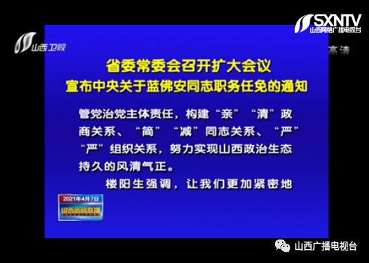 4月7日,省委书记楼阳生主持召开省委常委会扩大会议,宣布中央《关于蓝佛安同志职务任免的通知》,并就进一步加强政治建设提出要求。省委副书记、省长林武,省委副书记蓝佛安出席会议。