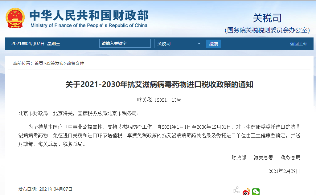 据财政部网站消息,财政部、海关总署和税务总局近日发布通知,为坚持基本医疗卫生事业公益属性,支持艾滋病防治工作,自2021年1月1日至2030年12月31日,对卫生健康委委托进口的抗艾滋病病毒药物,免征进口关税和进口环节增值税。享受免税政策的抗艾滋病病毒药物名录及委托进口单位由卫生健康委确定,并送财政部、海关总署、税务总局。