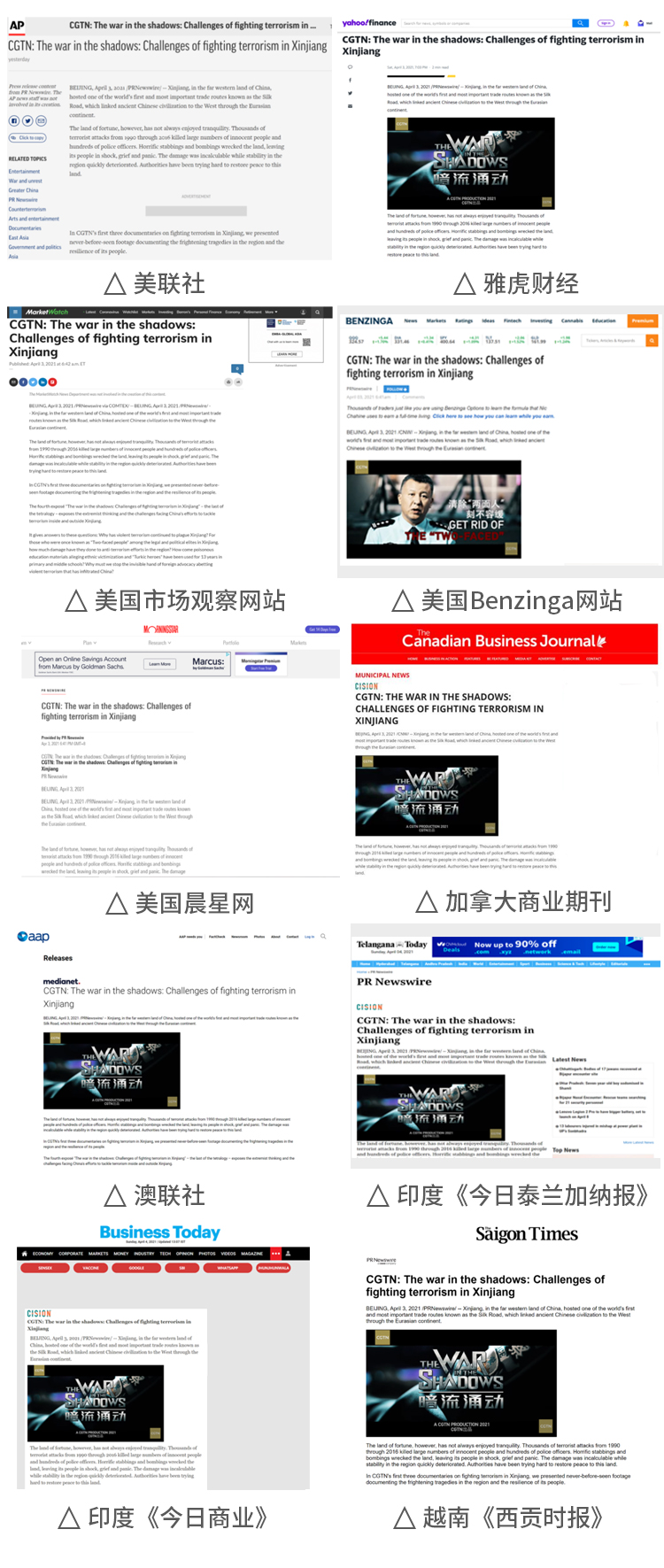 纪录片《暗流涌动——中国新疆反恐挑战》一经发布,引发国际主流媒体高度关注。CGTN特稿获得美联社、雅虎财经、美国市场观察网站、晨星网、澳联社、加拿大商业期刊、越南《西贡时报》、印度《今日商业》等39个国家和地区的323家海外网络媒体积极转载转引,触达全球受众达1.8亿。