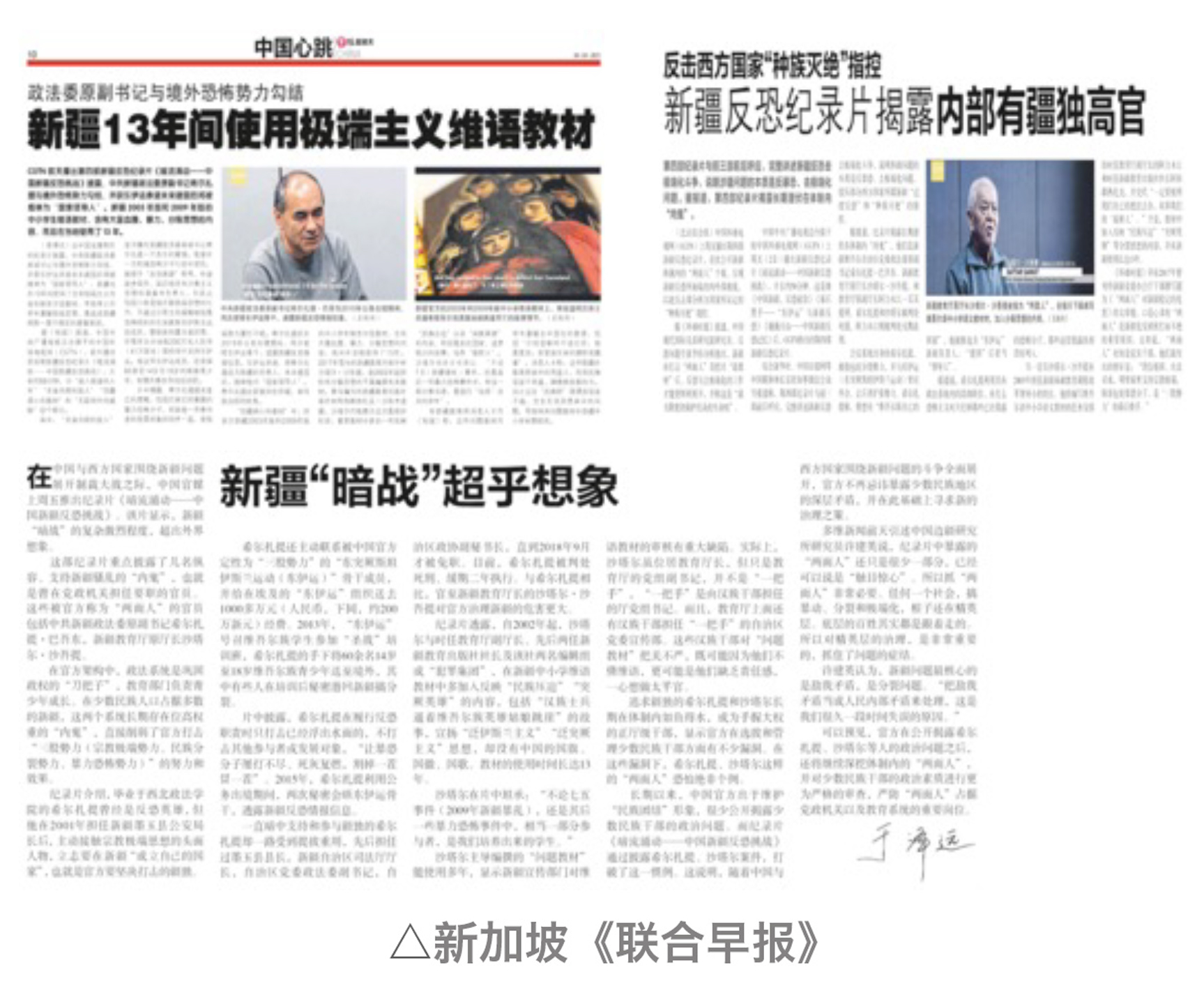 新加坡《联合早报》连续三天对纪录片《暗流涌动——中国新疆反恐挑战》进行了报道,关注新疆反恐整体情况,新疆政法系统官员与境外势力勾结、做“两面人”,以及新疆问题教材暗藏祸心,煽动恐怖主义等问题。报道《反击西方国家“种族灭绝”指控 新疆反恐纪录片揭露内部有疆独高官》指出,CGTN第四部涉疆纪录片与前三部前后呼应,完整讲述新疆反恐去极端化斗争,说明涉疆问题的本质是反恐、去极端化问题。
