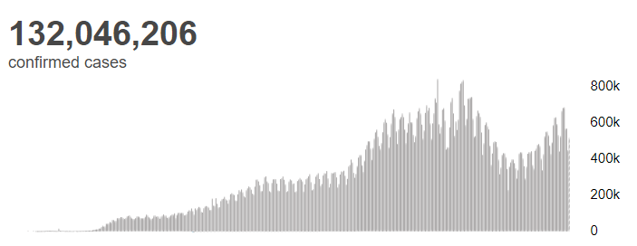 根据世卫组织最新实时统计数据,截至欧洲中部夏令时间4月7日15时34分(北京时间4月7日21时34分),全球累计新冠肺炎确诊病例132046206例,累计死亡病例2867242例。7日全球新增517585例新冠肺炎确诊病例,新增9264例死亡。