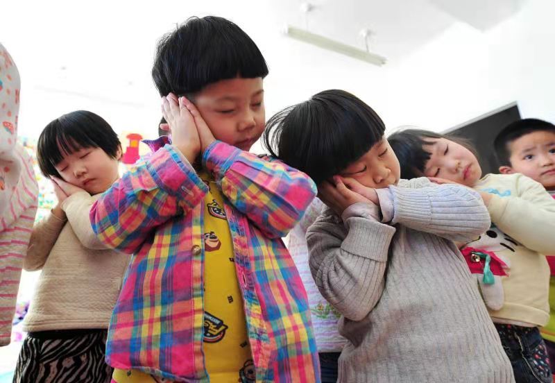 ↑孩子们在老师的指导下做睡眠游戏。(新华社资料片)