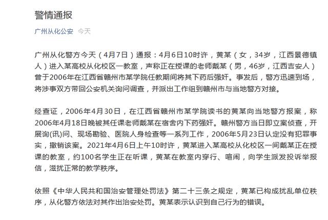 ·女子闯进课堂称被男教师迷奸,警方通报:没有犯罪事实,已被治安处罚。