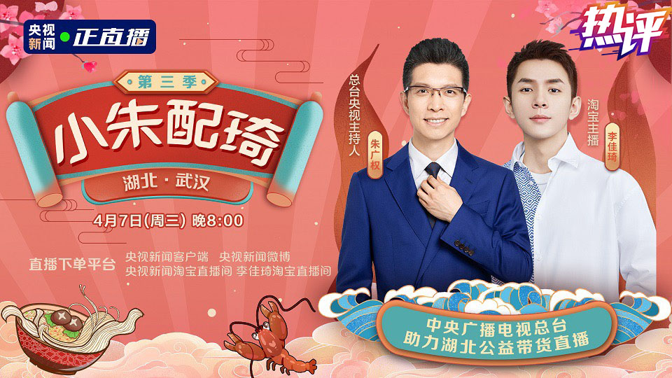 去年4月6日,为助力湖北经济复苏,“小朱配琦”首次组合带货直播,以隔空连线的形式,点燃了网友们为湖北“拼单”的热情。与此前不同,“小朱配琦”这次亲临武汉,在黄鹤楼下,开启了一场具有特殊意义的湖北专场公益直播。