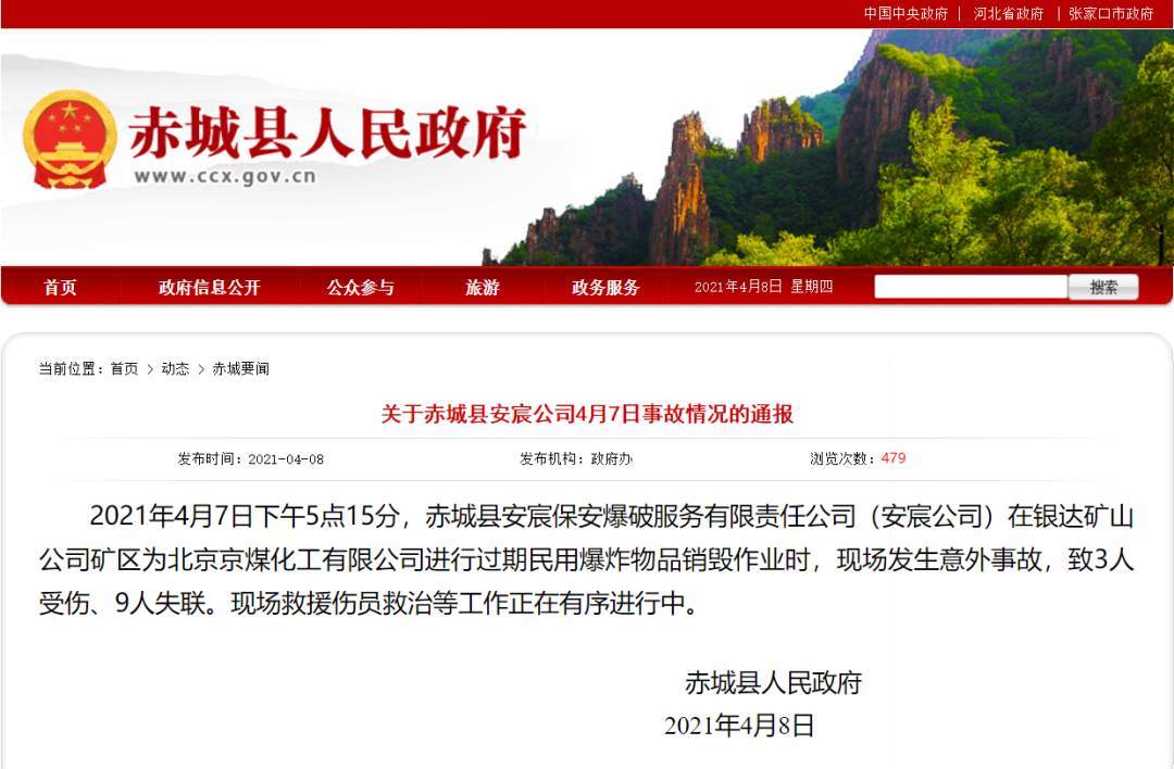 4月8日,河北赤城县发布通报,2021年4月7日下午5点15分,赤城县安宸保安爆破服务有限责任公司(安宸公司)在银达矿山公司矿区为北京京煤化工有限公司进行过期民用爆炸物品销毁作业时,现场发生意外事故,致3人受伤、9人失联。现场救援伤员救治等工作正在有序进行中。