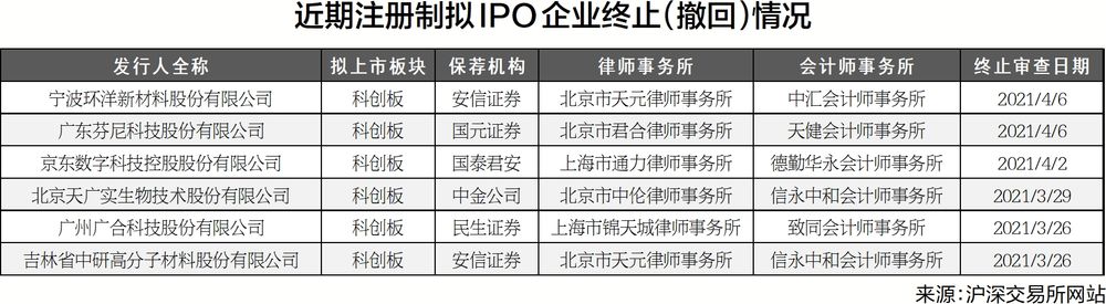 4月6日,上交所上市委发布公告称,终止对芬尼科技、环洋股份首次公开发行股票并在科创板上市审核。稍早之前的4月2日晚间,上交所公告,因京东数科撤回发行上市申请或者保荐人撤销保荐,将终止其科创板发行上市审核。