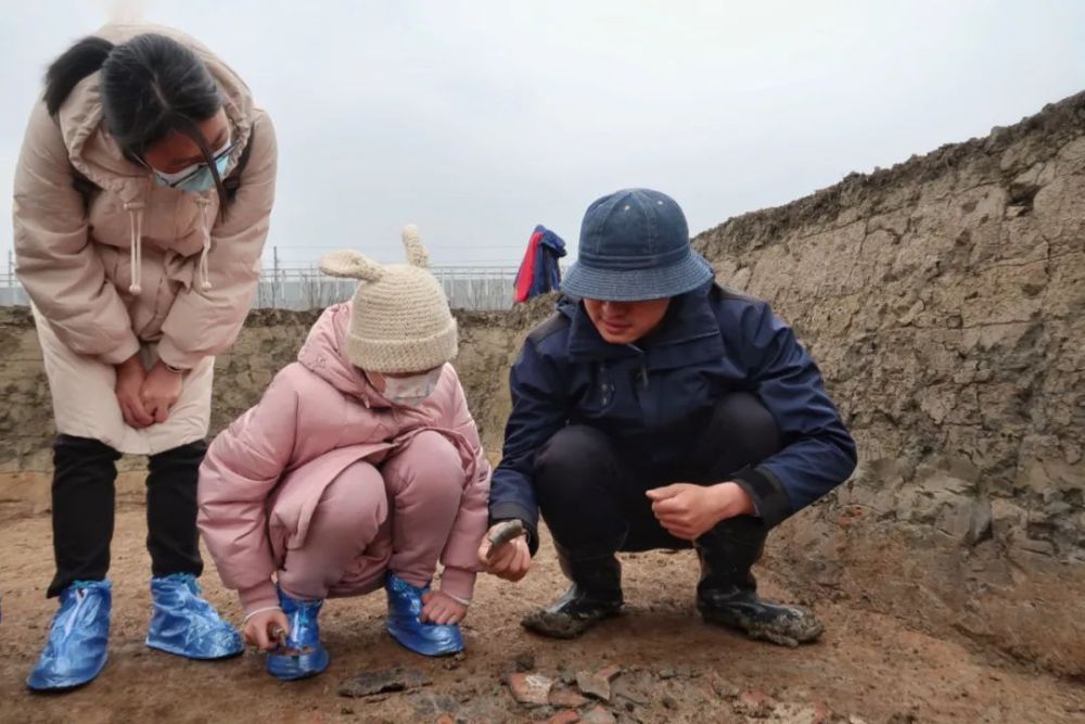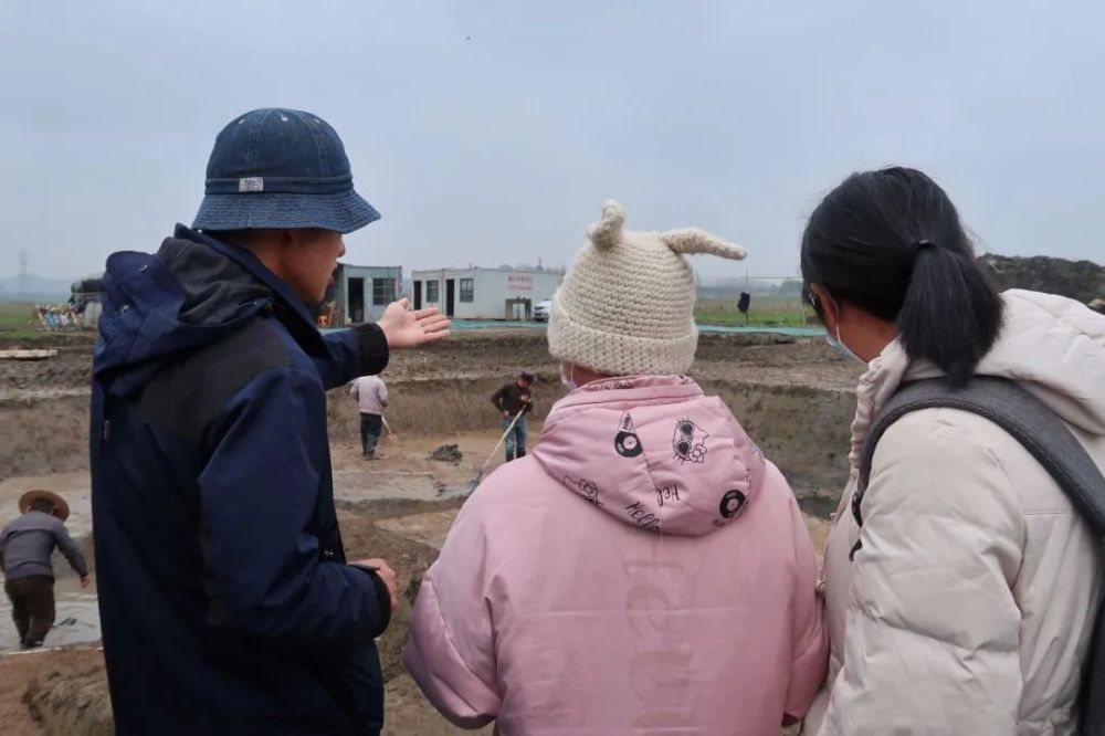 3月9日,杭州市文物考古研究所工作人员林森(右)在现场为牛牛(中)和妈妈(左)讲解考古知识。