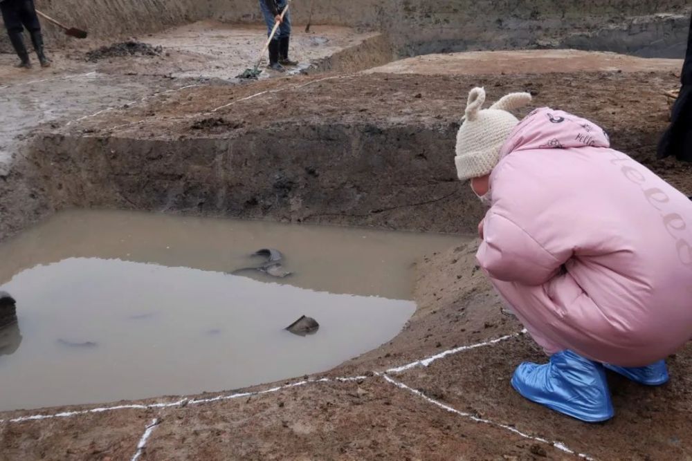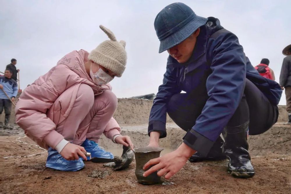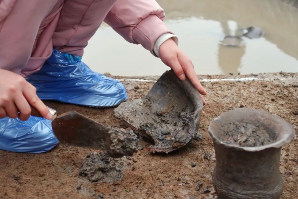 雨后,杭州周边一处考古遗址泥泞难行。11岁小女孩牛牛蹲下身,左手轻托着刚出土的残缺陶器,右手拿着手铲,仔细清理上面的泥垢。