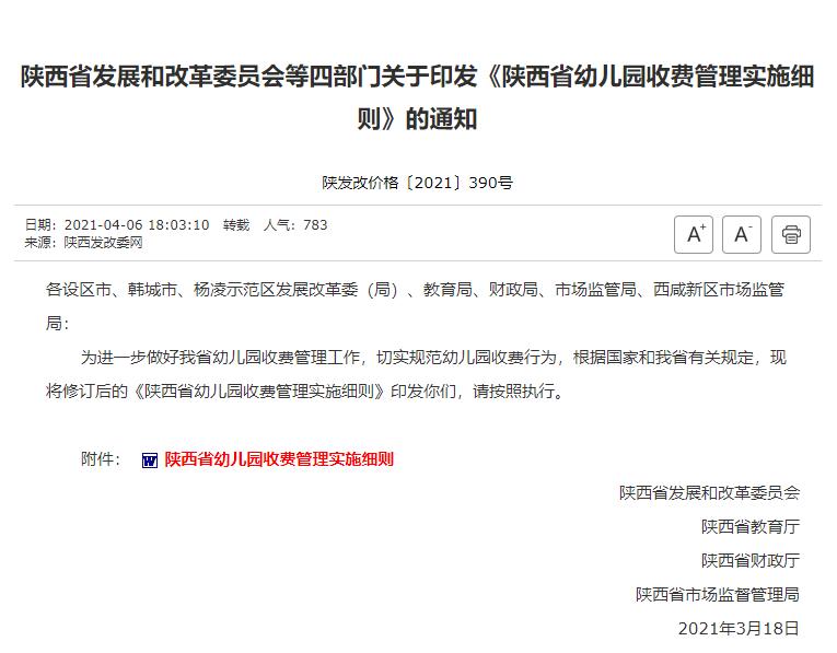 为进一步做好幼儿园收费管理工作,规范幼儿园收费行为,由陕西省发展和改革委员会、陕西省教育厅、陕西省财政厅、陕西省市场监督管理局等四部门修订后的《陕西省幼儿园收费管理实施细则》近日发布,将于4月起施行。