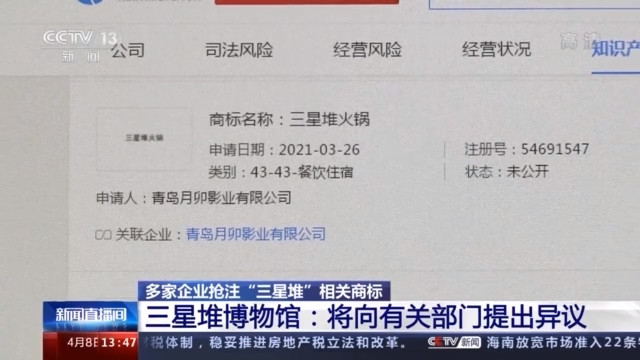 四川省广汉三星堆博物馆景区管理委员会产业发展部部长 任韧:很多商标我们觉得实际上跟三星堆不搭边,如果被别的企业或者个人利用了这个名字,生产或者销售一些和三星堆文化不相关的,甚至影响三星堆文化高度的一些产品的话,我们也是不愿意看到的。我们对之前被抢注的一些商标,已经开展了一些采取异议申请、无效宣告、撤销申请等商标保护的措施。最近这几天出现了这个情况,我们现在也正在了解收集,(准备)在公示阶段提出异议申请,但这个确实对我们来说会耗费大量精力和财力。