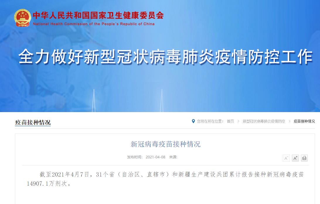 据国家卫健委官网消息,截至2021年4月7日,31个省(自治区、直辖市)和新疆生产建设兵团累计报告接种新冠病毒疫苗14907.1万剂次。