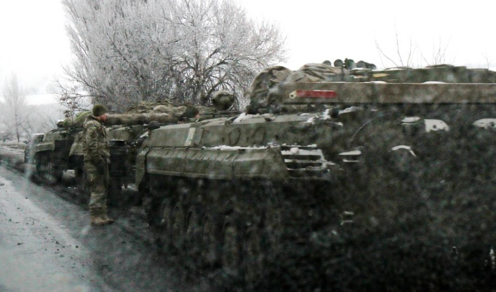 2016年12月24日在通往乌克兰顿涅茨克市的路上拍摄的从前线撤回的乌政府军装甲车。(新华社记者陈俊锋摄)