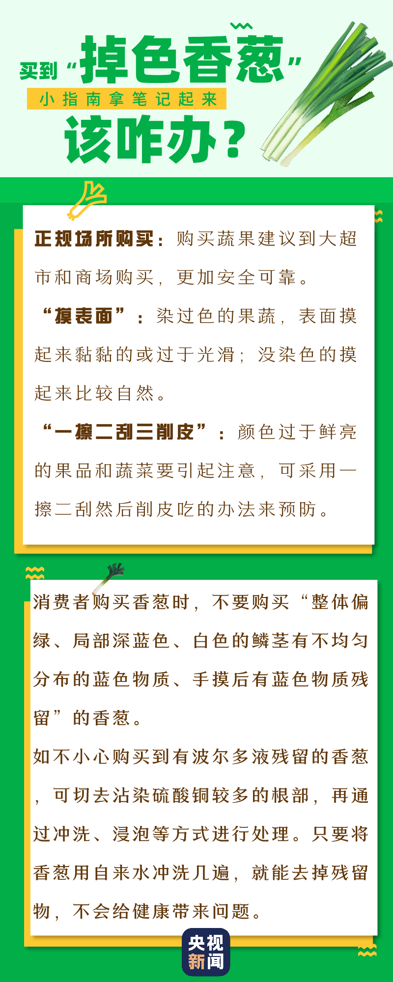 虽然经过处理的“掉色香葱”对人体没有多大的危害,但总归是不健康的。那么,我们在生活中该如何避“雷”?不小心购买到“掉色香葱”又该如何处理呢?