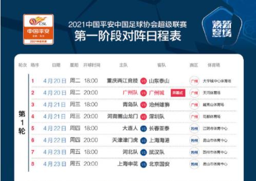 新华社北京4月8日电 8日,中超联赛正式公布第一阶段赛程。第一阶段比赛将于4月20日至5月17日以及6月21日至8月5日在广州和苏州两个赛区举行。揭幕战将于4月20日在广州城和广州队之间打响。