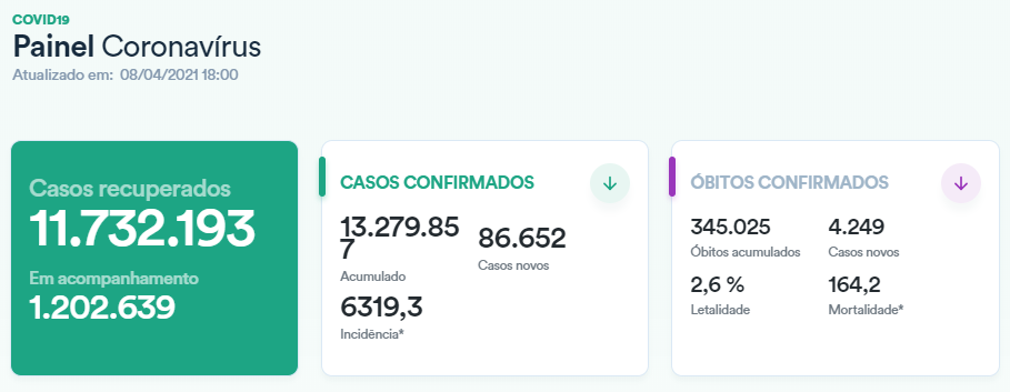 截至当地时间4月8日18时,据巴西卫生部发布的数据,该国累计新冠肺炎确诊病例达到13279857例,单日新增确诊病例86652例;累计死亡病例345025例,单日新增死亡病例4249例;巴西累计治愈人数达11732193人。