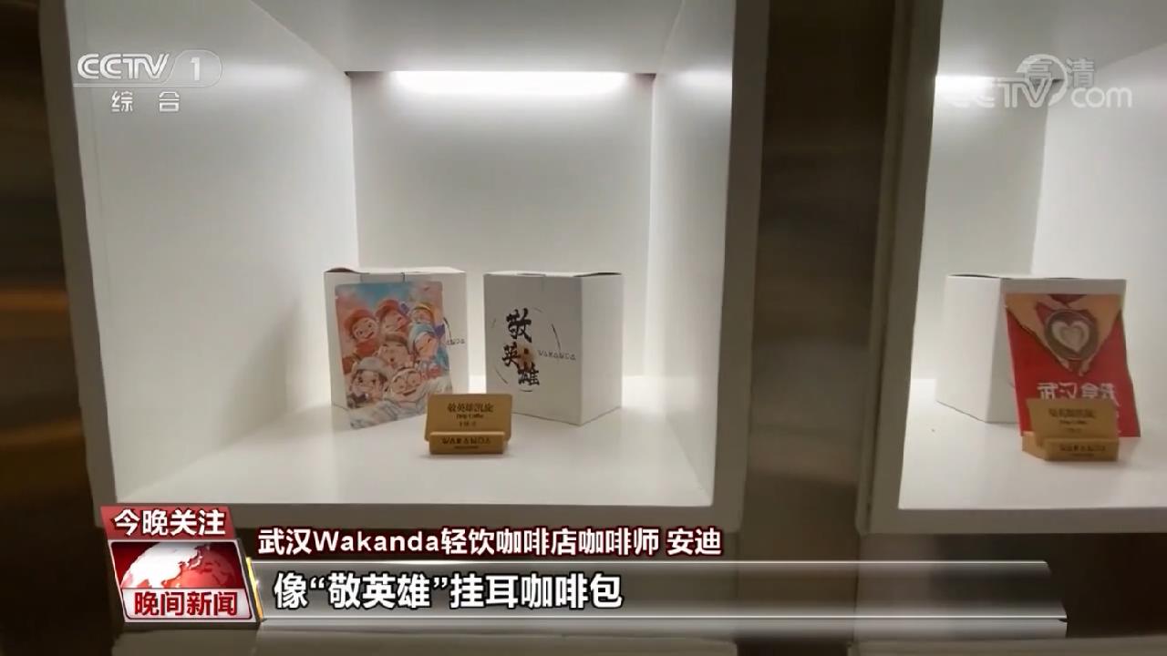 武汉Wakanda轻饮咖啡店咖啡师 安迪:像“武汉拿铁”也是在疫情期间,我们受到了奋斗在一线的医护的精神力的感染。像“敬英雄”挂耳咖啡包、“敬英雄”桌面杯,也是在疫情的时候推出的,是为了去记录一线的医护人员、警察和志愿者,他们的一些故事。
