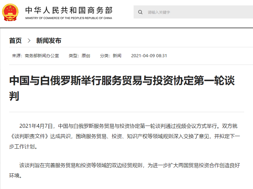 据商务部官网消息,2021年4月7日,中国与白俄罗斯服务贸易与投资协定第一轮谈判通过视频会议方式举行。双方就《谈判职责文件》达成共识,围绕服务贸易、投资、知识产权等领域规则深入交换了意见,并拟定下一步工作计划。
