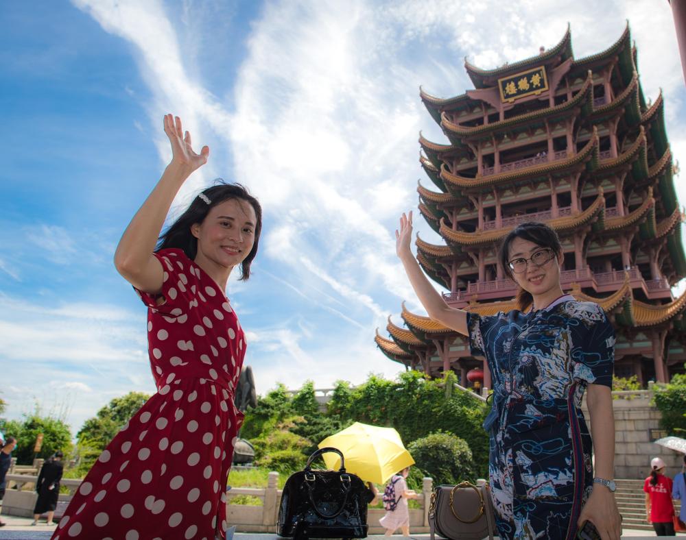 2020年8月7日,受邀来湖北旅游的海南援鄂医疗队员陈小妹(左)与同事计超在黄鹤楼景区观光。(新华社记者肖艺九摄)