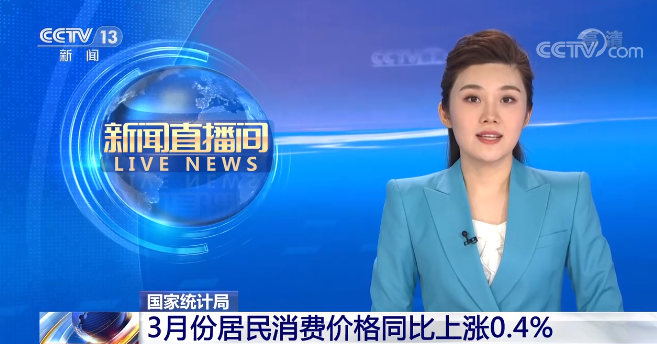 央视网消息:国家统计局今天(9日)公布的数据显示,今年3月份,全国居民消费价格同比上涨0.4%。其中,食品价格下降0.7%,非食品价格上涨0.7%。一季度,全国居民消费价格与去年同期持平。在工业品价格方面,3月份,全国工业生产者出厂价格同比上涨4.4%,环比上涨1.6%。1—3月平均,工业生产者出厂价格比去年同期上涨2.1%。