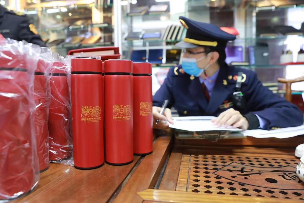 执法人员依法对以上两户当事人进行立案调查,并对带有“中国共产党成立100周年庆祝活动标识”的笔记本、保温杯、圆珠笔、伞罩、U盘等336件商品予以先行登记保存,目前案件正在办理中。
