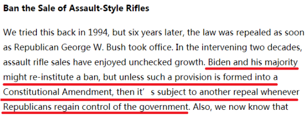 报道举例说明:美国早在1994年就试过禁止销售突击步枪,但6年后共和党人小布什一上任就废除了这项法律。从那时至今的20年里,突击步枪的销售一直在无节制地增长。报道还称,拜登和在国会占多数的民主党可能会重新制定一项禁令,但除非条款成为宪法修正案,否则一旦共和党重新控制政府,这项禁令就会再次被废除。
