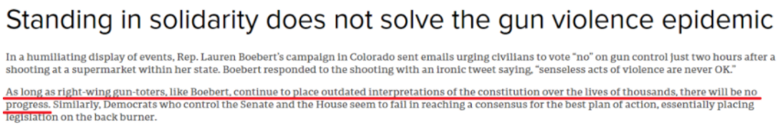 美国《泰坦日报》举例指出,立法者本可以用立法手段从根本上解决美国对枪支的痴迷,然而,党派分歧阻止了一切:科罗拉多州众议员劳伦·博伯特的竞选团队在该州一家超市发生枪击事件仅两小时后,就发电子邮件敦促民众对任何枪支管制提案投反对票。事实上,只要像博伯特这样的右翼拥枪分子继续把“过时的宪法解释”置于成千上万人的生命之上,美国在控枪问题上就不会有任何进展。