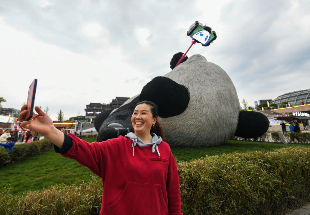 4月7日,一名游客在“自拍熊猫”雕塑前拍照。