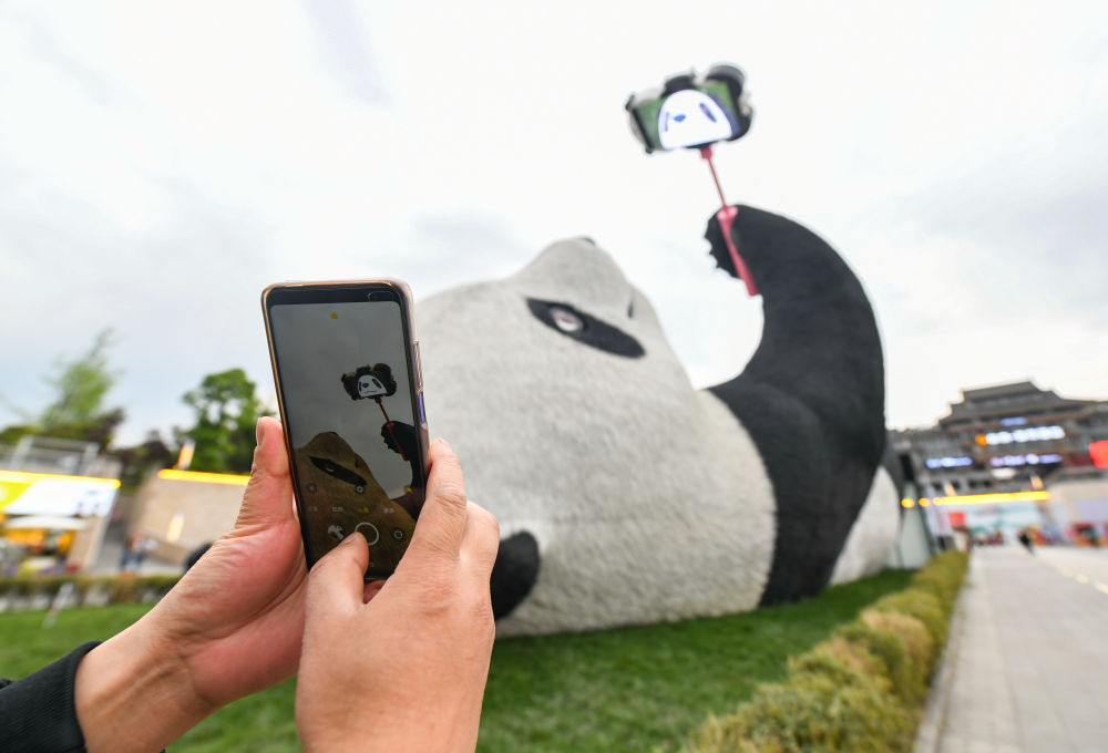 4月7日,一名游客使用手机拍摄“自拍熊猫”雕塑。