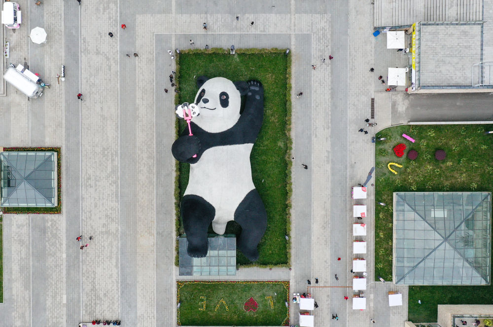 这是4月7日在四川省都江堰市仰天窝广场拍摄的“自拍熊猫”雕塑。