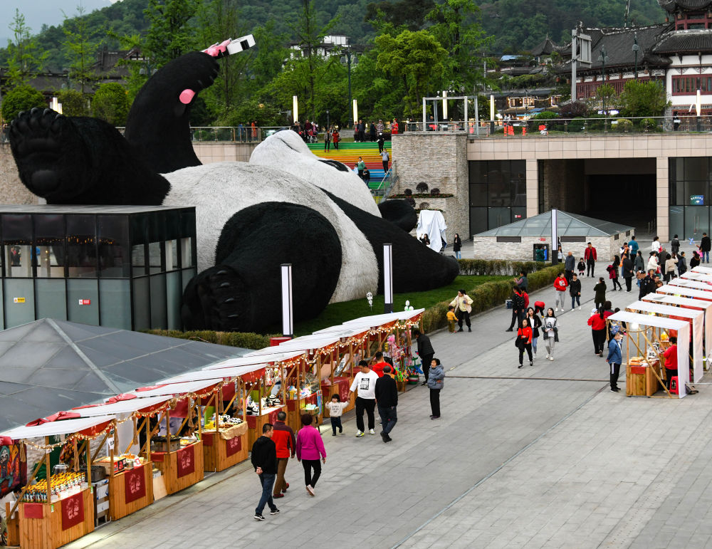 4月7日,游客在“自拍熊猫”雕塑旁边的文创集市消费。
