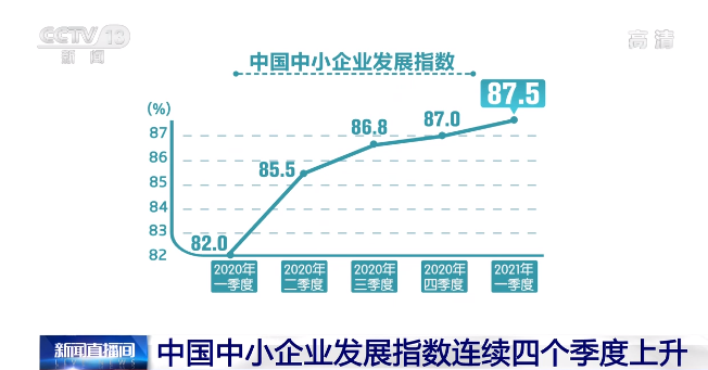 央视网消息:中国中小企业协会今天(9日)发布,一季度中国中小企业发展指数为87.5,已连续4个季度上升。