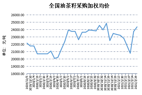 从全国市场看,油茶籽压榨已临近尾期,部分油茶企业已暂停油茶压榨工作,含油率在25%以上的油茶籽采购量明显下降,采购均价小幅上行。含油率在25%以上的油茶籽采购均价为24416.00元/吨,较上一统计日(2021年3月20日)23756.42元/吨上涨659.58元/吨,涨幅2.78%。