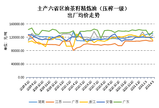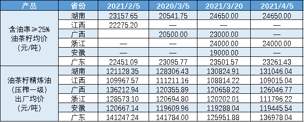数据显示,截至4月5日,3月下半月全国重点省区油茶生产加工企业油茶籽精炼油(压榨一级)出厂均价较3月上半月微幅上涨。其中,湖南、江西、安徽三省重点企业油茶籽精炼油(压榨一级)出厂均价较3月上半月呈微幅上涨趋势,分别上涨0.17%、0.18%和0.13%;广西、广东两省区重点企业油茶籽精炼油(压榨一级)出厂均价较3月上半月涨幅较大,分别上涨4.47%和8.75%;浙江省重点企业油茶籽精炼油(压榨一级)出厂均价较3月上半月下跌6.99%。