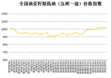 截至2021年4月5日,全国油茶籽精炼油(压榨一级)价格指数报1024.57点,较上一统计日(2021年3月20日)1018.30点上涨6.27点,涨幅0.62%,指数较上期微幅上行;指数较基期上涨24.57点,涨幅2.46%。