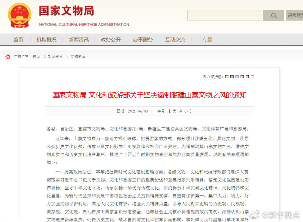 【国家文物局、文化和旅游部:坚决刹住滥建山寨文物之风】国家文物局、文化和旅游部近日印发通知,明确要求坚决刹住滥建山寨文物之风。各级文物行政部门要依法加强管理,对文物保护单位应当尽可能实施原址保护;对不可移动文物进行修缮、保养、迁移,必须遵守不改变文物原状的原则;不可移动文物已经全部毁坏的,应当实施遗址保护,未经批准不得在原址重建;对馆藏文物和不可移动文物中单体文物的复制,必须严格依法履行审批手续。(记者施雨岑)