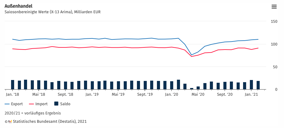 德国联邦统计局当地时间9日公布的初步数据显示,经工作日和季节调整后,德国2021年2月商品出口额环比上升0.9%,达到1078亿欧元,连续第10个月录得增长。不过,同比依旧下降了1.2%。德国2021年2月商品进口额环比上升3.6%,达到897亿欧元,同比上升0.9%。