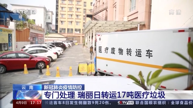 今天(9日)上午,在瑞丽市兴安社区收集点,工作人员正在保洁人员的帮助下,把一箱箱医疗垃圾搬上医疗废物转运车。这些医疗垃圾将被运送至郊区的医疗医废处置中心,进行专门的收集和处理。