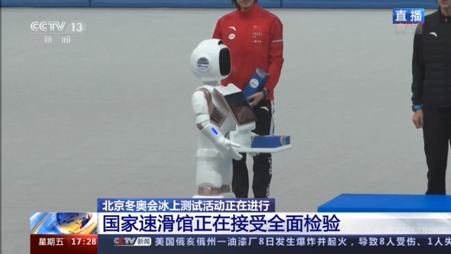 总台记者 何畅:我现在正是在国家速滑馆的比赛场地,现场目前正在进行的颁奖测试活动非常有意思,我们可以看到颁奖嘉宾正在给运动员颁奖,它可不是一般人,它是一台智能机器人,别看这个智能机器人走起路来的样子萌萌哒,实际上能力还不小,一方面它可以给运动员进行这种无接触的颁奖;另外一方面,它可以识别运动员的身份,通过不同的语言去给运动员进行祝贺,比如像中文的“恭喜你,你划得真是太棒了”,包括英文的“congratulations”等等。目前这台机器人还在测试当中,我们相信未来它将会具备更加娴熟的颁奖动作,同时也能储备更多的语言。