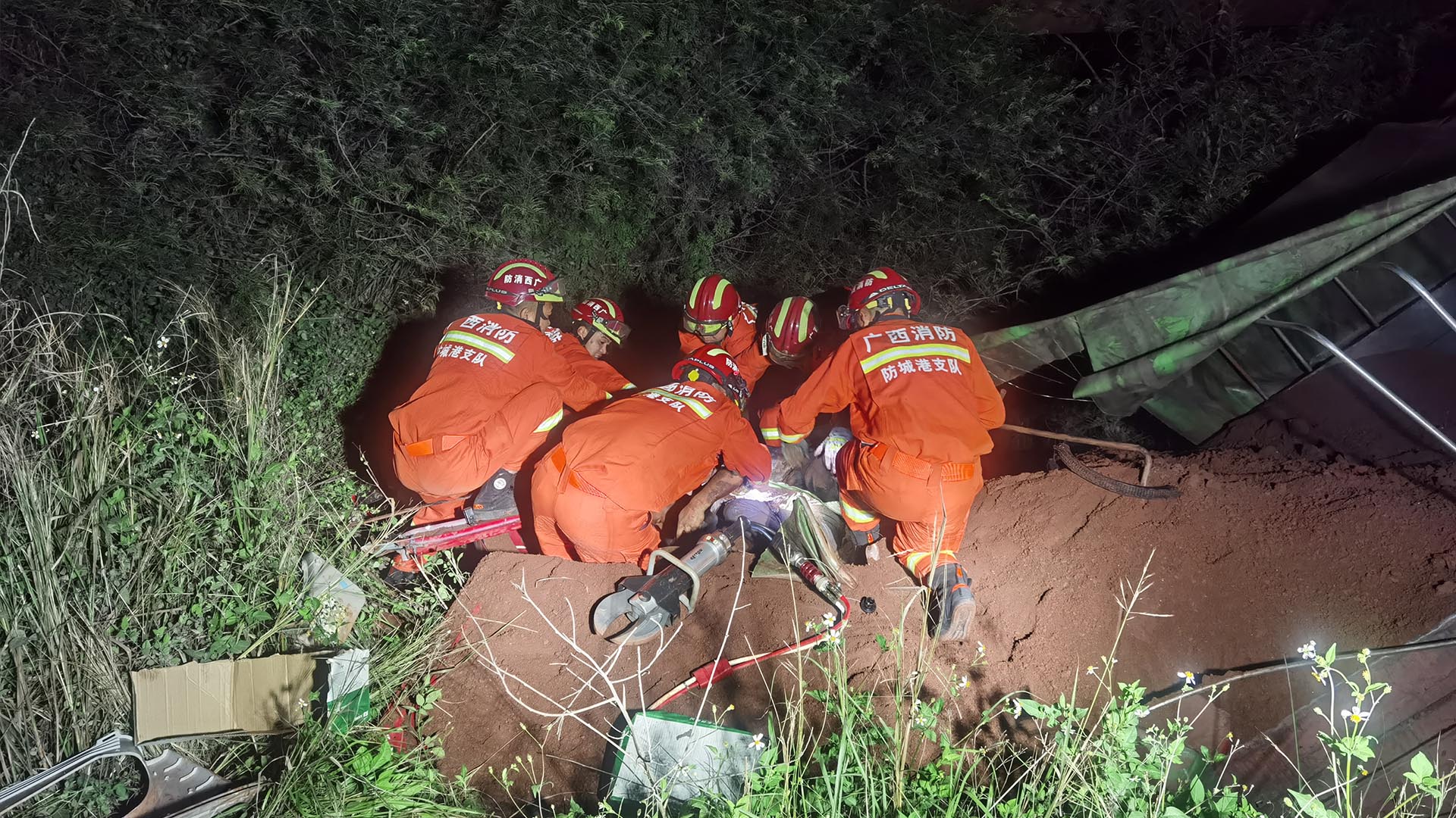 4月9日凌晨,广西防城港市港口区赤沙路发生一起车祸,驾驶员被困驾驶室,并被随车运载的泥土掩埋无法动弹。接到报警后,当地消防紧急赶赴现场处置。