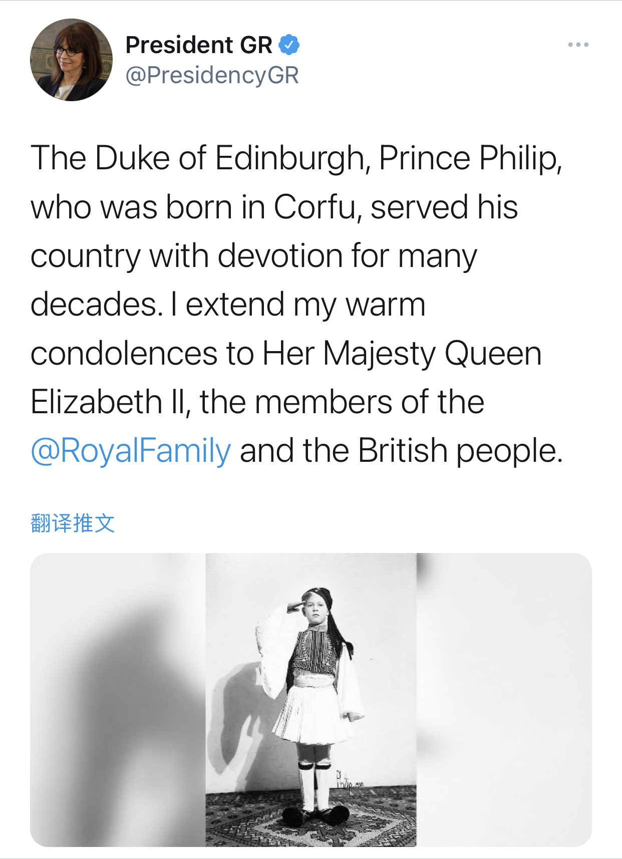 她表示“爱丁堡公爵菲利普亲王出生于(希腊)科孚岛,他为他的国家奉献了数十年。 我向女王伊丽莎白二世、英国皇室和英国人民表示沉痛哀悼。”(总台记者 李冠男)