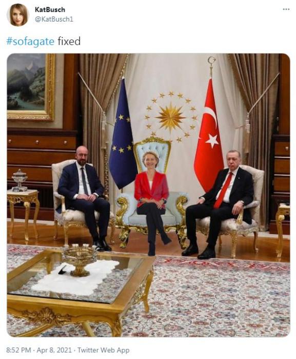 而在现场“安然入座”的米歇尔,更是因“未能维护自己的同事”,遭到网友口诛笔伐。网友称,“你本应该拒绝入座,直到冯德莱恩有位子。”还有网友干脆给米歇尔指了另一条“路”——“坐到冯德莱恩旁边的沙发上。”