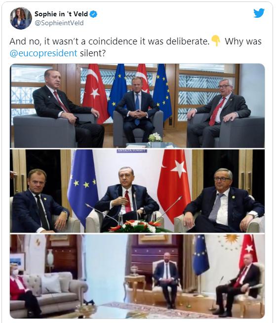 埃尔多安在与前任男性欧盟领导人会晤时,三位领导人并排坐在相同的椅子上。图片来源:社交媒体截图。