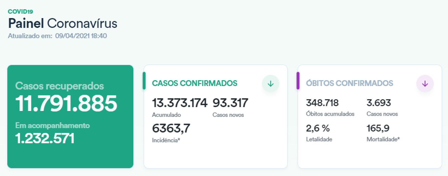 截至当地时间4月9日18时40分,据巴西卫生部发布的数据,巴西全国累计新冠肺炎确诊病例13373174例,单日新增确诊93317例;累计死亡病例348718例,单日新增死亡3693例;累计治愈病例11791885例。