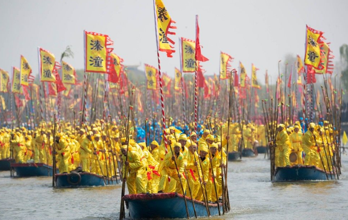 在2021中国泰州姜堰溱潼会船节上,参加会船表演的选手奋力向前。