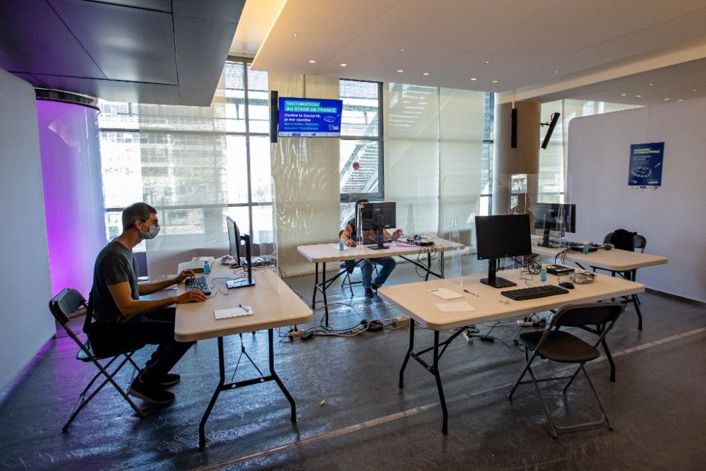 3月31日,在法国巴黎附近的圣丹尼,工作人员在法兰西体育场内设立的新冠疫苗接种中心做准备工作。(新华社发,奥雷利安·莫里萨尔摄)