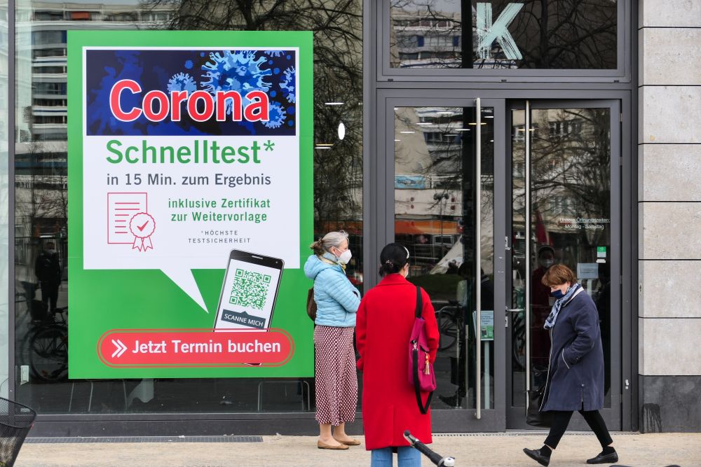 4月9日,在德国首都柏林,人们在一处新冠检测点外排队等候。(新华社发,斯特凡·蔡茨摄)