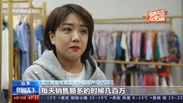 临沂跨境电商直播小镇商户 徐乙可:每天销售额多的时候几百万,去年我们销售额达到一个多亿,飞的变化,太好了!