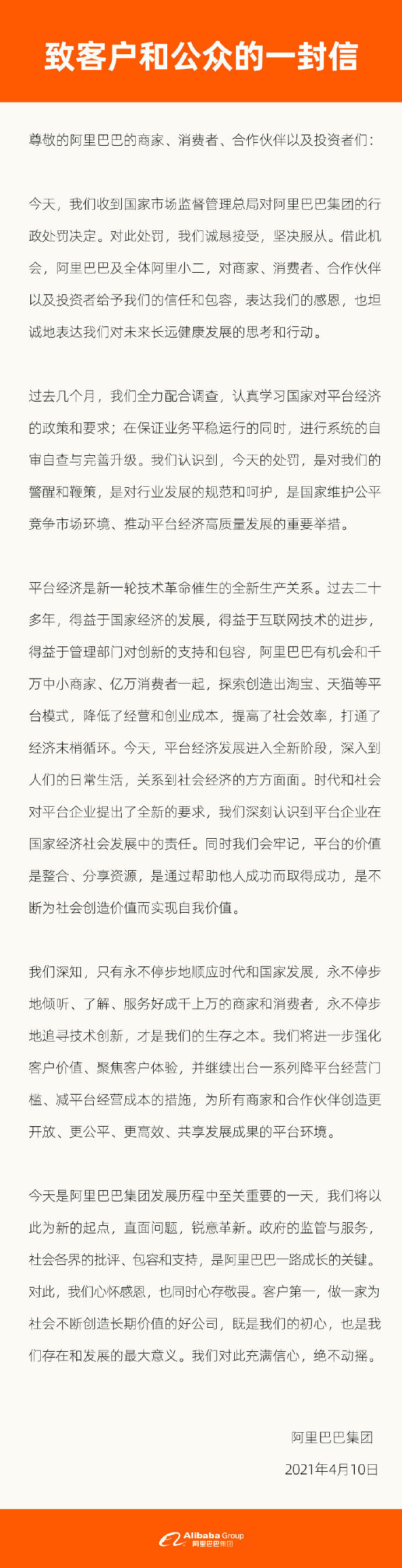 阿里巴巴在官微上发布致客户和公众的一封信 :今天的处罚是对我们的警醒和鞭策,将心存感恩、心存敬畏。