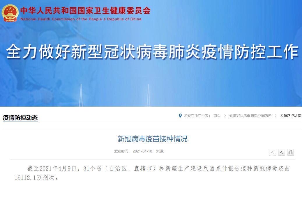 据国家卫健委官网消息,截至2021年4月9日,31个省(自治区、直辖市)和新疆生产建设兵团累计报告接种新冠病毒疫苗16112.1万剂次。